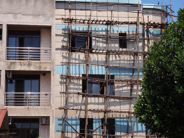 On our trip to Uganda, so many things don’t “fit” easily into one’s mind. The modern era mixes with the 1600’s like two colors of paint poured out onto a canvas. Highways and ox carts mix. Modern apartments are built with bamboo scaffolding. Thatched roofs on huts with TV satellite dishes are common. Worship in a mud-wall church with no power is interrupted by the musical tones of cell phones. A home has an open fire kitchen and solar panels. The people, too, are both modern and ancient. Full of old customs and ways, yet discussing micro-finance loans. One sees classical garments, bright prints with puffed sleeves, or worn-through “Just do it” T-shirts.