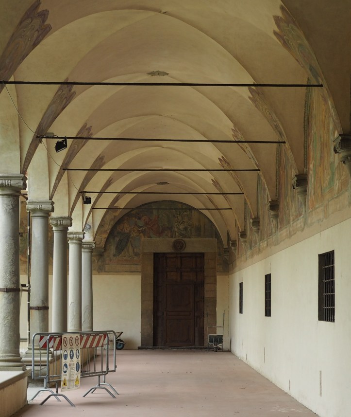 At the top of the flight of stairs leading to the sleeping quarters of San Marco is arguably the most-famous, and most-copied work ever of Fra Angelico. This large Annunciation fresco shows the archangel Gabriel announcing to Mary that she is soon to be pregnant with the Son of God. Part of what I love is that Angelico paints this event happening on the porch at San Marco, as you can still see from the photo of restored walkway below. The painting is a “here and now” reminder to the monks of God’s continuing story and still-present messengers. In almost all of them, a monk in Italian dress joins in or prays.